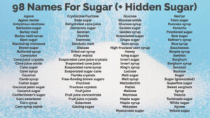 Not only do Americans need to learn how sugar affects our health negatively they need to become proactive and make smarter food choices. Parents are in control of their family’s health and most of the time moms are in charge of meals and snacks for their families. Hopefully the list below will help to see how much sugar along with calories, protein and saturated fat are in many snacks. Below is the many names for sugar you can find in the ingredient list. But you can also read the Nutrition Facts on the food label to determine how many grams of Total Sugar and grams of Added Sugar is in a serving of the food.